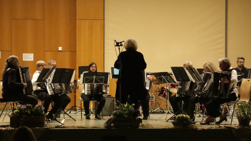 Im Anschluss daran spielte das Orchester des Harmonika-Spielrings Malmsheim, unter der Leitung von Renate Till-Kienle bis zur Pause drei weitere Stücke, darunter bekannte Melodien wie Bridge over Troubled Water und The Lion Sleeps Tonight.