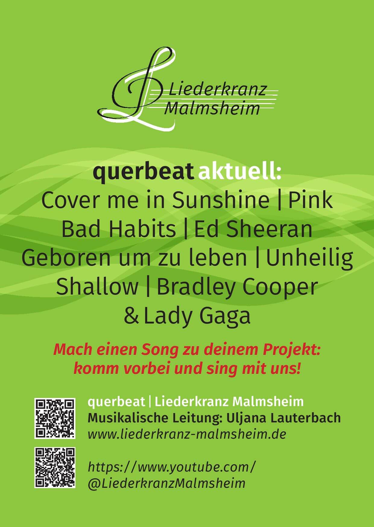 „Ich, Uljana Lauterbach, leite seit Juli 2013 den Chor „Querbeat“ des Liederkranzes Malmsheim. Großen Wert lege ich auf eine gute Tonbildung und den richtigen Umgang mit der Stimme, dem Atem und dem Resonanzkörper. Musik ist eine Sprache, die überall verstanden wird, davon bin ich überzeugt.