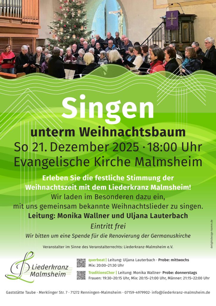 Erleben Sie die festliche Stimmung der Weihnachtszeit mit dem Liederkranz Malmsheim! Auch in diesem Jahr laden wir herzlich zu unserem traditionellen Singen unterm Weihnachtsbaum ein. Seien Sie dabei und genießen einen stimmungsvollen Abend mit klassischen und modernen Weihnachtsliedern – wir laden im Besonderen dazu ein, mit uns gemeinsam bekannte Weihnachtslieder zu singen, um die Vorweihnachtszeit stimmungsvoll einzuläuten.