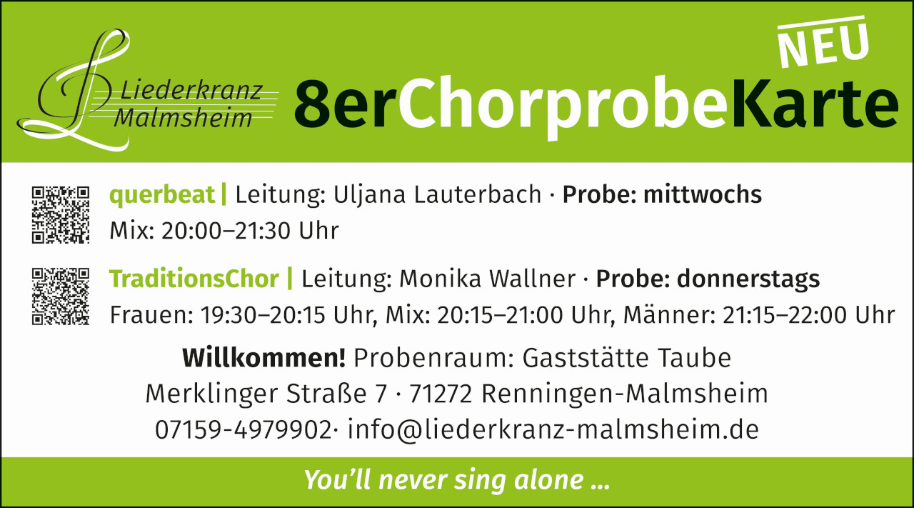 Stadthalle Leonberg Römerstraße 110, Leonberg, GermanyDer TraditionsChor des Liederkranz Malmsheim singt zusammen mit dem Klassik-Chor des Sängerbund Rutesheim im 2. Teil in der Stadthalle in Leonberg.